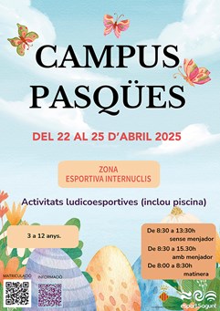 Por lo que respecta al Campus Pasqües de la Concejalía de Actividad Física, Salud y Deportes, la octava edición se llevará a cabo, como es habitual, en el Polideportivo Municipal (internúcleos). El campus estará compuesto por actividades lúdico-deportivas, incluyendo piscina. El Campus Pasqües está destinado a niños y niñas de entre 3 y 12 años. La oferta está limitada a alrededor de 100 plazas, tal y como ha informado el concejal de Actividad Física, Salud y Deportes, Javier Timón.
