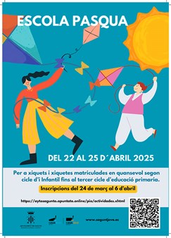 Por otro lado, la Escola Pasqua de la Concejalía de Juventud e Infancia está destinada a niños y niñas matriculados en centros de infantil y primaria nacidos desde el 2013 al 2021, ambos incluidos. Las actividades se llevarán a cabo tanto en el CEIP Josep Romeu como en el Casal Jove de Puerto de Sagunto y las plazas son limitadas. Habrá grupos de 3 a 6 años, de 7 a 9 años y de 10 a 12 años.