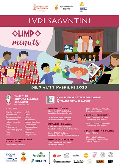 Los Lvdi Saguntini rememorarán el pasado clásico de la ciudad desde el lunes 7 al viernes 11 de abril con varios talleres didácticos de cultura clásica, así como con la XXVIII edición del Festival de Teatro Grecolatino en la que se representarán nueve obras en el Teatro Romano de Sagunto. Durante estos días, miles de estudiantes de la ciudad, pero también de otros lugares de España disfrutarán aprendiendo de los diversos talleres de cultura clásica y de las obras de teatro interpretadas por grupos de estudiantes.