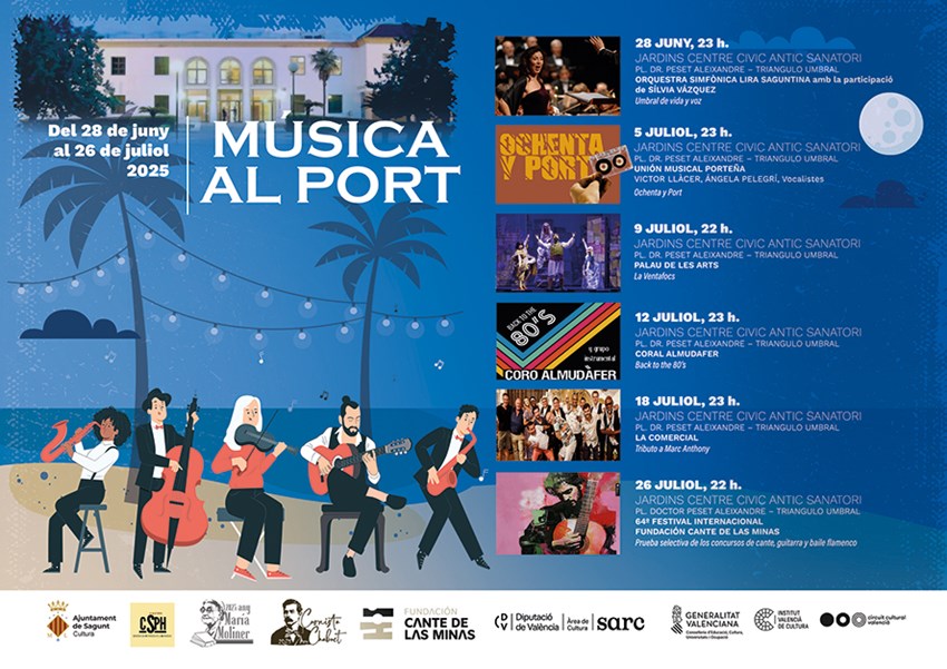 El festival Música al Port regresará, un verano más, a los jardines del Centro Cívico Antiguo Sanatorio de Puerto de Sagunto del 28 de junio al 26 de julio. En esta ocasión lo hará con una variada oferta lírica gratuita para todos los gustos y públicos y, por supuesto, con las tradicionales pruebas selectivas de los concursos del Festival Internacional Fundación Cante de las Minas.
