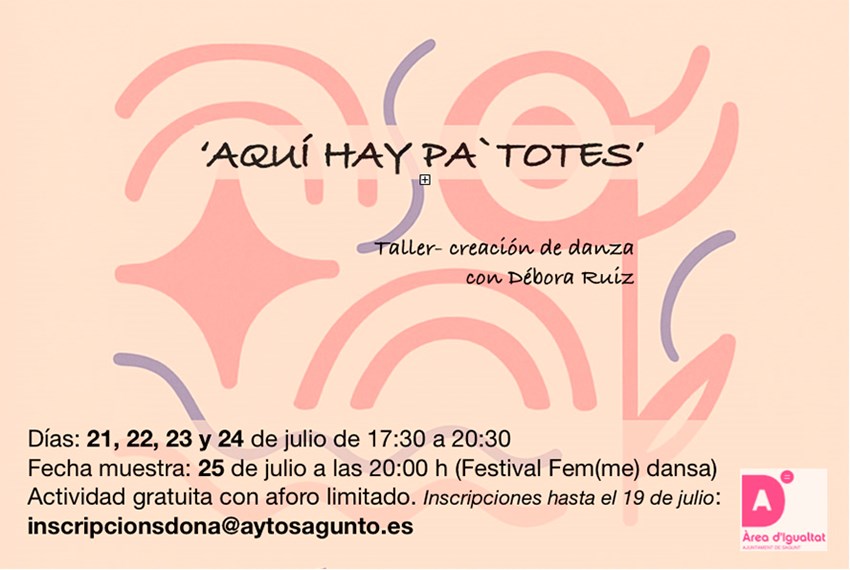 El taller se desarrollará los días 21, 22, 23 y 24 de julio de 17:30 a 20:30 horas, y el colofón será la muestra que servirá de inauguración al festival, el 25 de julio a las 20 horas. La actividad es gratuita, pero requiere el compromiso de asistir a las sesiones y a la representación final. Las plazas son limitadas. Aquellas mujeres interesadas en participar pueden solicitar inscribirse a través del correo electrónico inscripcionsdona@aytosagunto.es hasta el 19 de julio.
