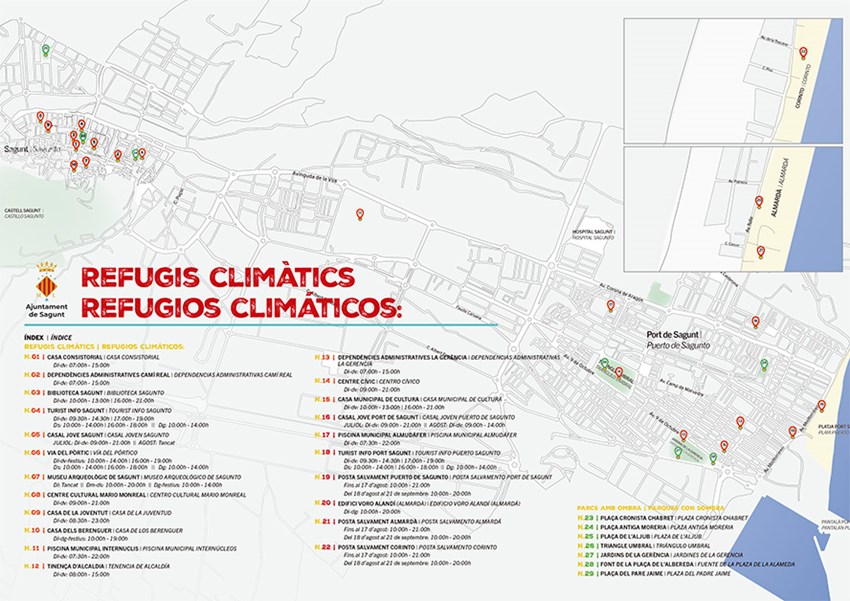 El Ayuntamiento de Sagunto ha creado una red de refugios climáticos por toda la ciudad para ayudar a la ciudadanía a combatir las altas temperaturas. En total se han habilitado más de 20 espacios para este fin. Esta acción se ha realizado en cumplimiento de una moción de Compromís per Sagunt aprobada por unanimidad en un pleno de la Corporación Municipal.