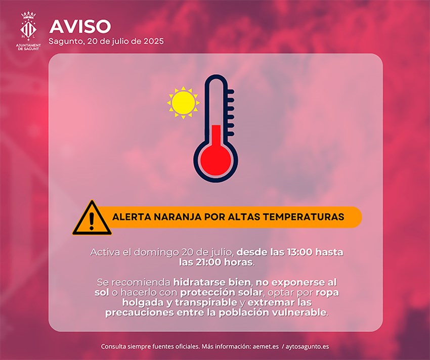 La Agencia Estatal de Meteorología (AEMET) ha elevado la alerta por altas temperaturas a nivel naranja (riesgo importante) para el próximo domingo 20 de julio en todo el litoral norte de Valencia, zona geográfica en la que se encuentra Sagunto. La alerta estará activa desde las 12 a las 21 horas con una temperatura máxima prevista de 39 grados, aunque la AEMET estima que valores más altos se den en el interior.