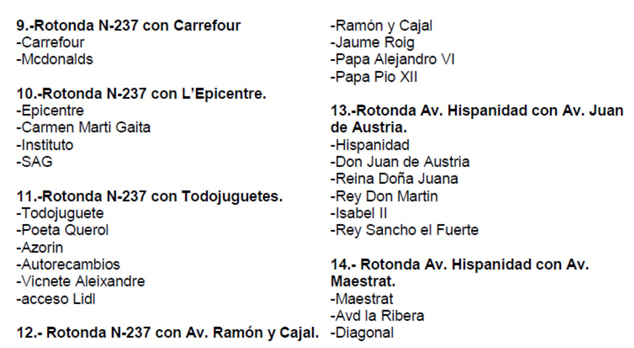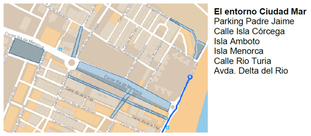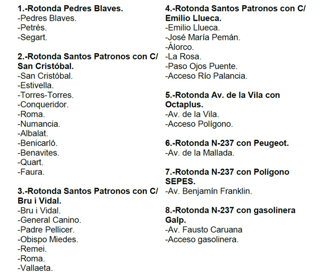 Además, en el núcleo de Puerto de Sagunto, desde el día anterior quedarán cortadas y sin vehículos estacionados, también a partir de las 15.00 h, una serie de calles de dos zonas próximas a la meta, situada en la zona norte de la avenida Mediterráneo: calles del entorno del Casal Jove y de la urbanización Ciudadmar. En concreto, estas calles son: Vent de Gregal, Vent de Marinada (y todas sus perpendiculares), Vent de Provença, Isla Córcega, Isla Amboto, Isla Menorca, Río Turia, avda. Delta del Río y aparcamiento Padre Jaime (frente al colegio Vilamar).