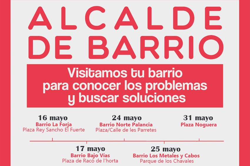 El próximo lunes, 16 de mayo, acudirá a la plaza del Rey Sancho el Fuerte del barrio La Forja; al día siguiente, el 17, lo hará en la plaza del Racó de l’Horta, en el barrio de Bajo Vías; el martes 24 será el turno del Barrio Norte del Palancia, en la plaza/calle de Les Parretes; al día siguiente, el 25, irá al parque de los Chavales, en el barrio Los Metales y Cabos; y, por último, el día 31 será el encuentro de la plaza Noguera. La asistencia, como siempre, es abierta a todas las personas interesadas en plantear sus sugerencias o dudas al primer edil.