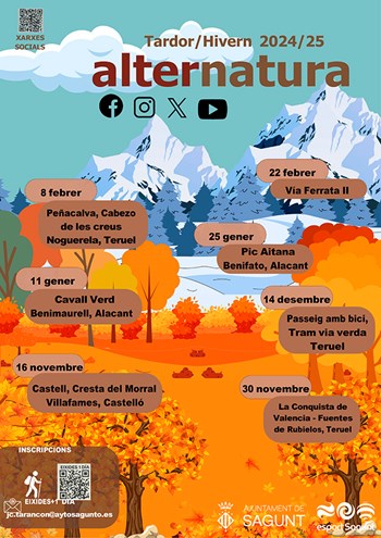 La programación de Alternatura continúa el 14 de diciembre con un paseo en bicicleta, con una dificultad baja por la vía verde de Teruel. Y la primera ruta de 2025 tendrá lugar el 11 de enero por el Cavall verd de Benimaurell (Alicante) con una dificultad moderada. El 25 de enero los organizadores de Alternatura han programado una excursión de dificultad alta que consistirá en el ascenso al pico Aitana por la canal de Benifato (Alicante).