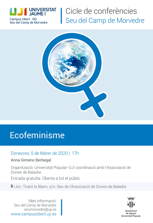 La Universidad Popular de Sagunto y la Universitat Jaume I (UJI), en colaboración con la asociación de Mujeres de Baladre han programado para este miércoles, 5 de febrero, la conferencia ‘Ecofeminisme’, de Anna Gimeno Berbegal, periodista y diplomada en sociología. La charla forma parte del ciclo de conferencias de la sede de la UJI del Camp de Morvedre y comenzará a las 17 horas en la sede de la Asociación Mujeres de Baladre, ubicada en la calle Tirant lo Blanc.
