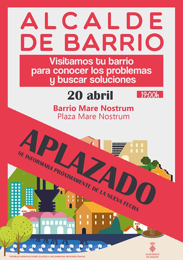 El Ayuntamiento de Sagunto informa de que el encuentro de la iniciativa Alcalde de Barrio previsto para este miércoles por la tarde en la plaza Mare Nostrum se aplaza hasta nuevo aviso debido a las malas condiciones meteorológicas.