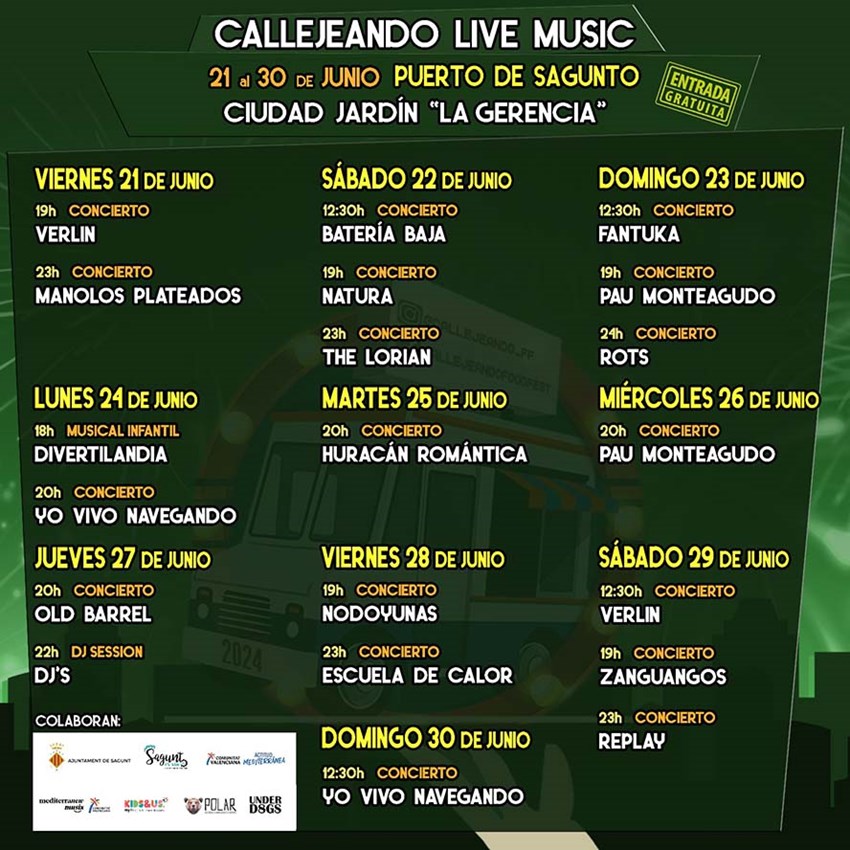 Hoy, 21 de junio, ha accionado a las 19 horas en la ciudad jardín La Gerencia, donde se ubica este festival, el concierto de Verlin y esta noche, a las 23 horas, será el turno de los Manolos Plateados. Mañana a las 12:30 actuará Batería Baja, por la tarde a las 19 horas será el turno de Natura ya las 23 horas de The Lorian. El domingo a las 12:30 actuará Fantuka, a las 19 horas estará en concierto Pau Monteagudo ya las 24 horas será el turno de Rots. El lunes 24 actuará Divertilandia a las 18 horas ya las 20 horas habrá un concierto de Yo vivo navegando. El martes 25 a las 20 horas estará en concierto Huracán romántico y el miércoles 26 volverá a actuar Pau Monteagudo a las 20 horas. El jueves 27 a las 20 horas el público podrá disfrutar de Old Barrel a las 20 horas y las 22 horas habrá sesión de DJ's. El viernes 28 a las 19 horas actuará Nodoyunas ya las 23 horas Escuela de Calor. El sábado a las 12:30 será el turno de Verlin y a las 19 de Zanguagos, acabando el día con el concierto de Replay que será a las 23 horas. El último día del festival actuará a las 12 horas Yo vivo navegando.