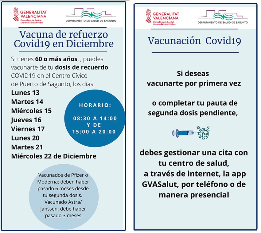La Concejalía de Sanidad del Ayuntamiento de Sagunto, en colaboración con el Departamento de Salud de Sagunto, informa de que a partir del próximo lunes, 13 de diciembre, se volverá a abrir el Centro de Vacunación del Centro Cívico Antiguo Sanatorio de Puerto de Sagunto como centro de vacunación masiva.