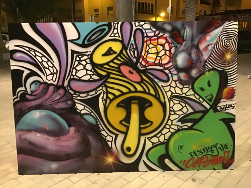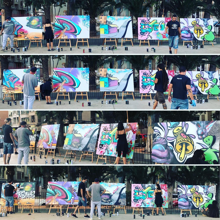 Cada uno de los artistas tuvo 30 minutos para pintar un lienzo. Pasado ese tiempo y en dirección de las agujas del reloj, cada artista pasó al siguiente lienzo para continuar pintando sobre el trabajo del anterior. La temática era libre y, al final, entre todos los grafiteros/as pintaron los cinco lienzos.