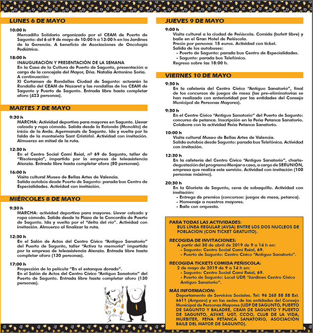 Para todas las actividades, AVSA pondrá a disposición de las personas mayores un autobús de línea regular entre los dos núcleos de población con ticket gratuito. Para las actividades con invitación, aquellas personas interesadas podrán recogerlas a partir del 30 de abril al Centro Social de Camí Reial, 69, de Sagunto y en el Centro Cívico Antiguo Sanatorio de Puerto de Sagunto, de 9 a 14 horas. En cuanto a la recogida de tickets de la comida de la excursión de Peñíscola se hará el 2 de mayo, en horario de 9 a 14 horas, en el Centro Social de Camí Reial, 69, de Sagunto y en el local UDP de los Jardines del Centro Cívico Antiguo Sanatorio de Puerto de Sagunto. Para más información el departamento de Servicios Sociales pone a disposición de aquellos interesantes el teléfono 96 265 58 58 (extensión 6611) y en las sedes de las entidades del Consejo Municipal de Personas Mayores (UDP de Sagunto, de Puerto de Sagunto y de Baladre, el CEAM de Sagunto y de Puerto de Sagunto, ASVAT, UGT, CCOO, Club de la Vida, Murbíter, Peña Petanca Sanatorio y la asociación Baile del Mayor de Sagunto).