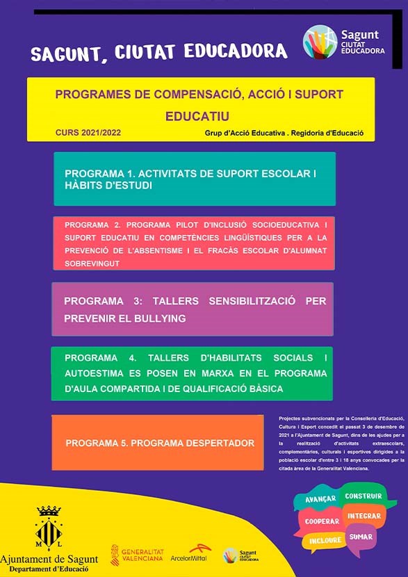 El departamento de Educación, dentro del marco del proyecto, ‘Sagunto, Ciudad Educadora' y a través del grupo de acción educativa, ha llevado a cabo durante el pasado curso 2021/2022, diferentes programas de actuación orientados hacia la acción, la compensación educativa y el apoyo educativo.