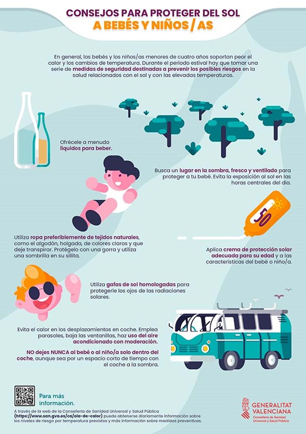 En el caso de los bebés y niños y niñas de menos de 4 años, estos soportan peor el calor y los cambios de temperatura. Hay que ofrecerles a menudo líquidos para beber, así como buscar un lugar en la sombra, fresco y ventilado para proteger a los bebés, evitando la exposición al sol en las horas centrales del día. La ropa de tejidos naturales, holgada, de colores claros y que deje transpirar también ayuda a proteger a los más pequeños del calor. Se debe aplicar la crema de protección solar adecuada para su edad y sus características y utilizar gafas de sol homologadas. En los viajes, se aconseja emplear parasoles, bajar las ventanillas y hacer uso del aire acondicionado con moderación. Además, en ningún caso se deberá dejar al bebé o al niño o niña solo dentro del coche, aunque sea poco tiempo y a la sombra.
