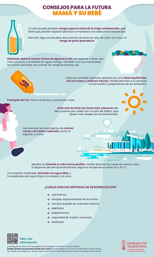 Actualmente, la zona de Sagunto no se encuentra en un riesgo alto por el calor. Sin embargo, desde la concejalía de Sanidad del Ayuntamiento de Sagunto se ofrecen una serie de consejos y recomendaciones a la ciudadanía para combatir los efectos de las altas temperaturas. Concretamente en este caso, para las mujeres embarazadas, los bebés y las personas mayores. Algunos estudios, incluso, demuestran que durante las olas de calor es mayor el riesgo de parto prematuro.