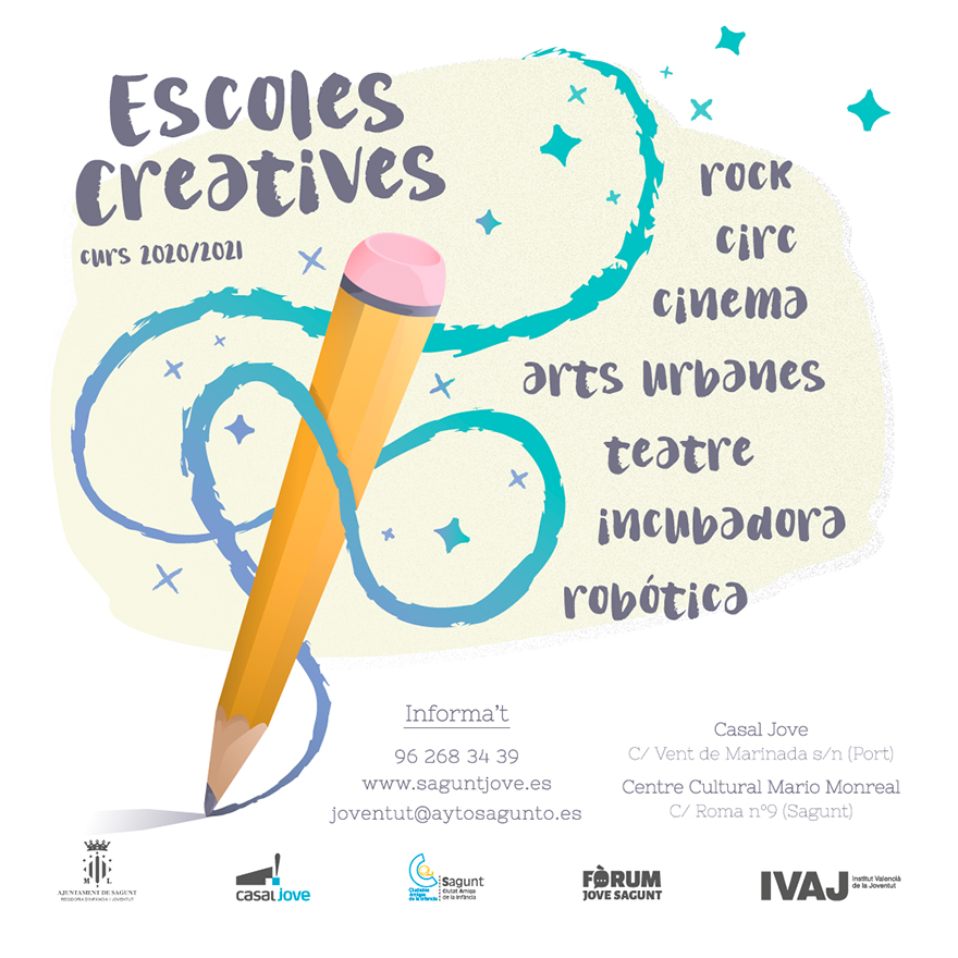 La Concejalía de Juventud e Infancia del Ayuntamiento de Sagunto ha puesto en marcha las Escuelas creativas dirigidas a la infancia, a la adolescencia y a la juventud de hasta 35 años. El próximo curso 2020-2021 se prepara con numerosos talleres de siete modalidades de formación artística los cuales se desarrollarán en el Casal Jove de Puerto de Sagunto de octubre a mayo.