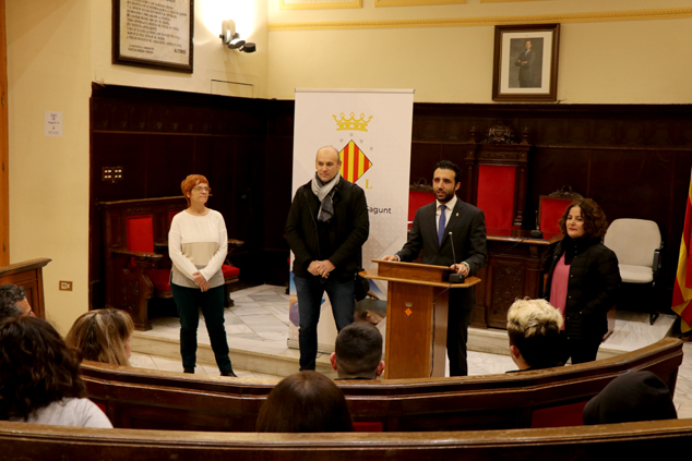 El alcalde de Sagunto, Darío Moreno, ha recibido esta mañana a los alumnos del IES Clot del Moro y miembros del profesorado, con el objetivo de empezar las diversas actividades que se desarrollarán hoy, por segundo año consecutivo, por parte del proyecto ‘Mirades al teatre’ de este centro educativo. Esta jornada tiene como finalidad conocer el Sagunto histórico, ya que muchas veces las personas no lo conocen, según explica el profesorado. Por eso, los alumnos de primero, segundo, tercero y cuarto de ESO y EFP básica 1 y 2 hoy durante todo el día disfrutarán de dos actividades; la primera, una visita guiada por la judería, el teatro romano y el castillo; y una segunda, compuesta por un conjunto de pruebas de destrezas o ingenios a lo largo del recorrido.