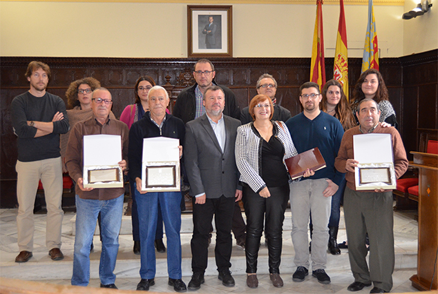 El alcalde de Sagunto, Quico Fernández, el delegado de Personal, Sergio Moreno, y otros concejales de la Corporación Municipal han homenajeado, en el salón de plenos del Ayuntamiento de Sagunto, a cuatro funcionarios que se han jubilado durante 2016. Se trata de José Manuel Romero Molina, Manuel Bellves Mas, Vicente Baeza Sánchez e Inmaculada Morales Vendrell.
