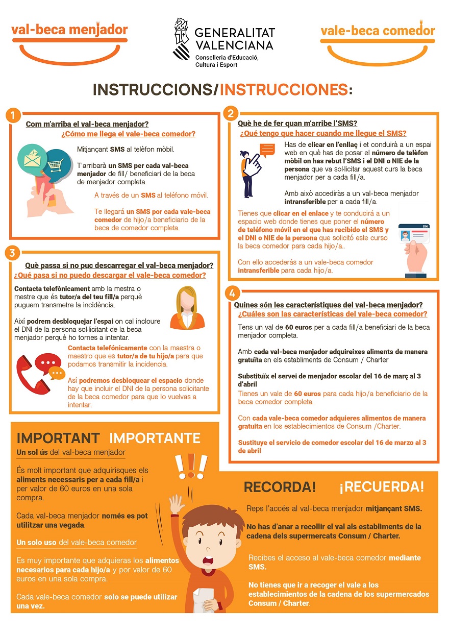 Con ello, se accede a un vale intransferible para cada hijo/a a través del cual se pueden adquirir alimentos en Consum o Charter. El 'vale-beca comedor' tiene un valor de 60 euros y sustituye el servicio de comedor escolar del 16 de marzo hasta el 3 de abril.Cada 'vale-beca comedor' solo se puede utilizar una vez, por lo tanto, es muy importante que las familias adquieran los alimentos necesarios para cada hijo o hija y por valor de 60 euros en una sola compra.