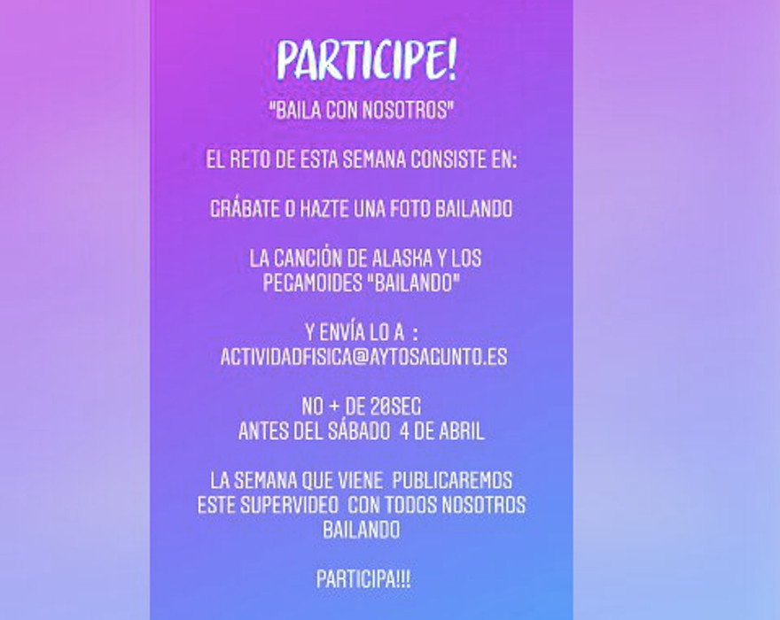 El área de actividad física y salud, del Ayuntamiento de Sagunto, anima a la ciudadanía a participar en el reto de grabarse mientras baila. Esta actividad que alude a la moda de filmarse y difundir el vídeo en redes consiste en bailar durante 20 segundos la canción Bailando de Alaska y Los Pegamoides para crear de forma colectiva un vídeo.