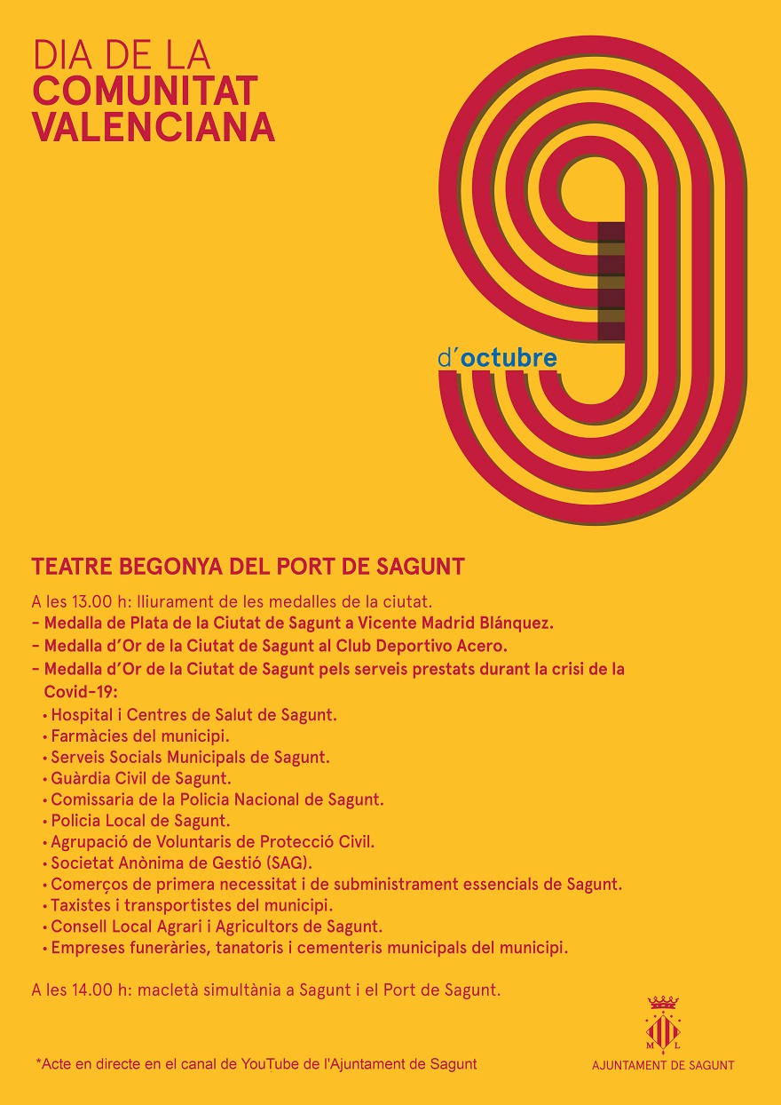 El Ayuntamiento de Sagunto celebrará el Día de la Comunitat Valenciana con un acto institucional de entrega de Medallas de Plata y de Oro de la Ciudad. El Teatro de Begoña de Puerto de Sagunto acogerá el viernes 9 de octubre, a las 13 h, el acto de homenaje a personas, clubes e instituciones públicas y privadas por su labor o servicios prestados, el cual será emitido en directo. Una vez finalizado, a las 14 h se dispararán dos mascletás simultáneas en Sagunto y en Puerto de Sagunto.