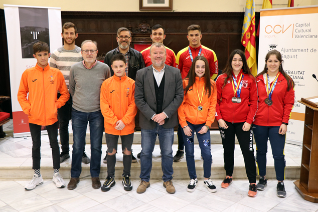 El alcalde de Sagunto, Quico Fernández, y el concejal de Deportes, Miguel Chover, han recibido en el Salón de Plenos a estos deportistas, acompañados de sus familiares y del presidente del club, Juan Carlos Morte, a los que se les ha hecho entrega de un distintivo conmemorativo.