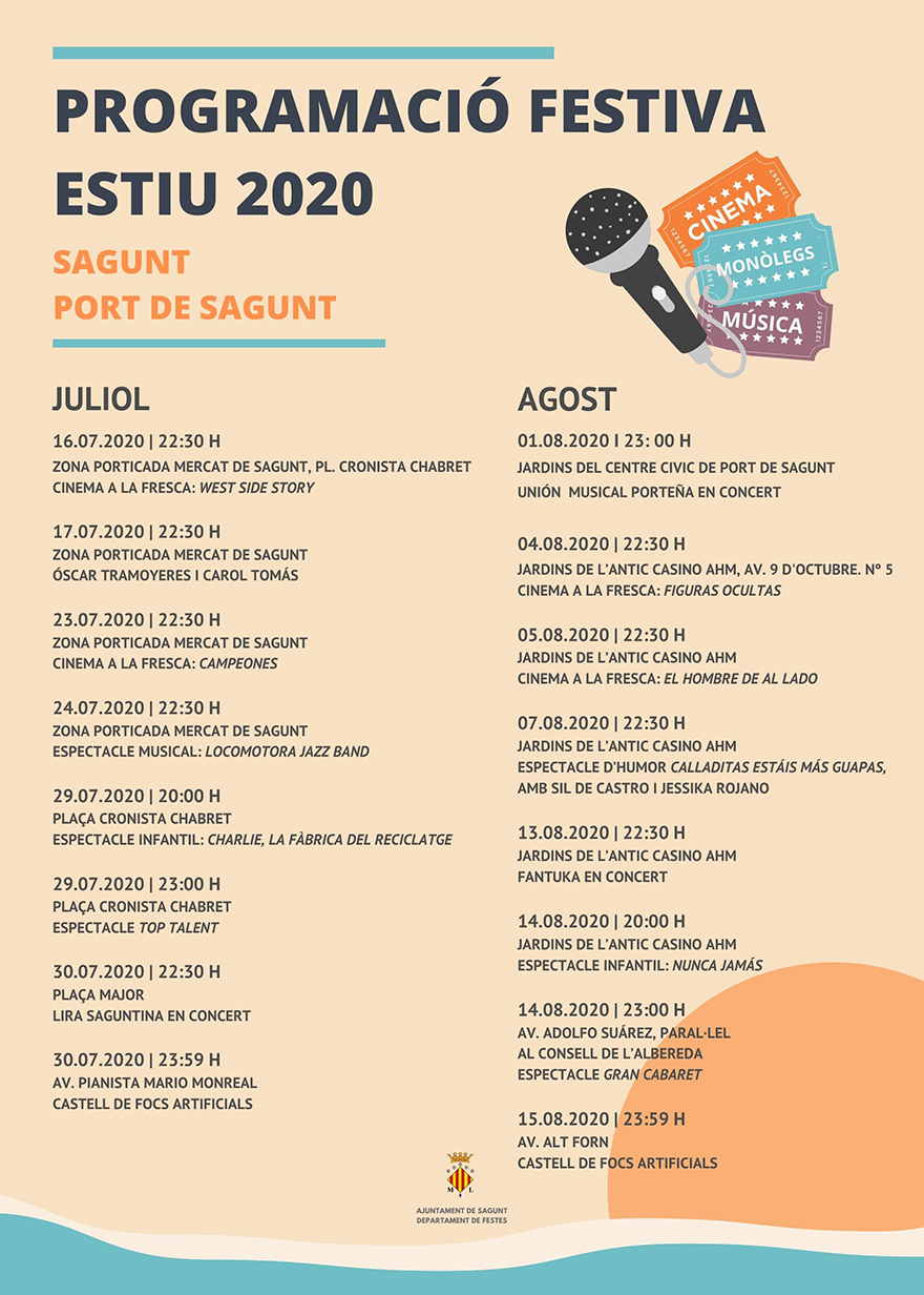 Hoy empiezan los actos de la programación festiva Verano 2020 que el departamento de Fiestas del Ayuntamiento de Sagunto ha preparado para toda la ciudadanía. Desde hoy, 16 de julio, y hasta el próximo día 30, los actos serán en el núcleo de Sagunto y del 1 al 15 de agosto los actos serán en el núcleo de Puerto de Sagunto.