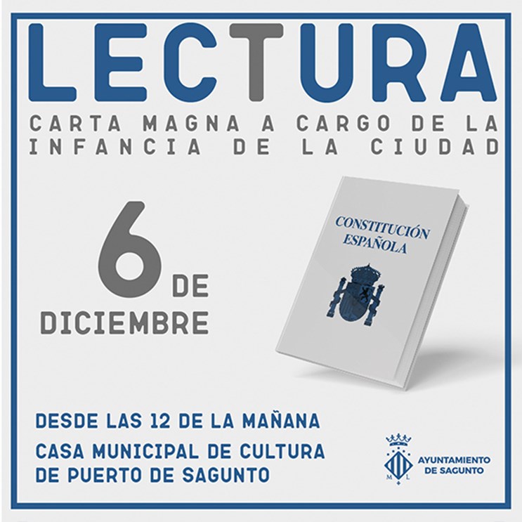 El Ayuntamiento de Sagunto invita a la ciudadanía a participar el Día de la Constitución en una lectura pública de la Carta Magna a cargo de la infancia del municipio. El próximo lunes 6 de diciembre, a las 12.00 horas, la Casa Municipal de Cultura de Puerto de Sagunto acogerá este acto.
