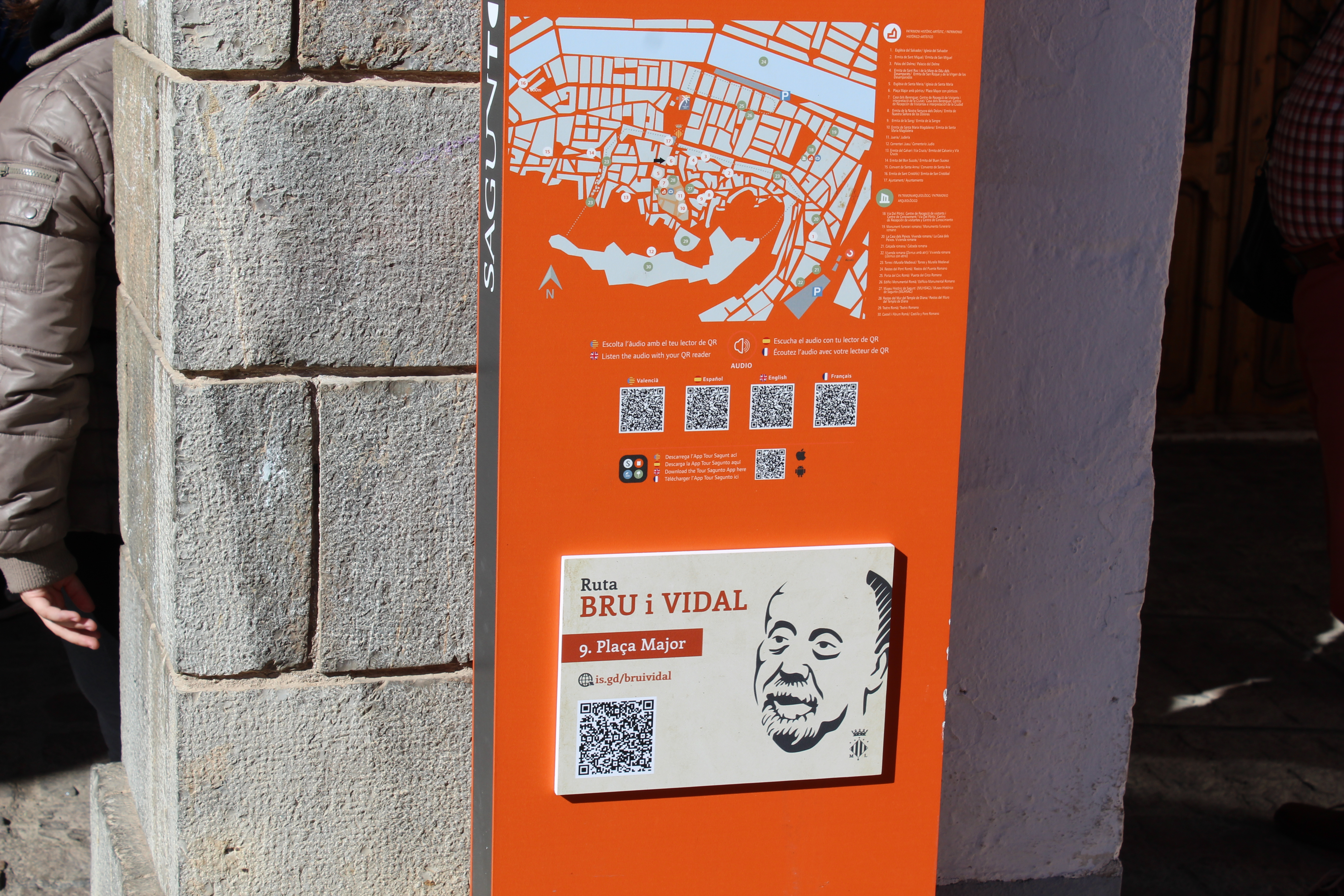 La ruta literaria de Bru i Vidal, que es una idea original de Olga Gargallo, profesora de secundaria de valenciano, marca una visita turística a la ciudad de Sagunto usando los poemas de Bru i Vidal. Con la ruta se podrá descubrir el Obelisco, la avenida Cronista Santiago Bru i Vidal, el río, la escuela, la Glorieta, la biblioteca, la calle Sant Dídac, el mercado, la Plaza Mayor, la iglesia de Santa María, la calle Cavallers, la calle Penya Esvaradora, el Calvario, el Teatro Romano, el Castillo, el Puerto de Sagunto, el cementerio, las ‘Penyetes’, la calle Mayor y el Camí Reial.