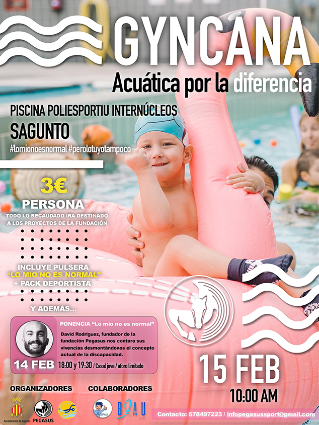 El Ayuntamiento de Sagunto y la Fundación Pegasus con la colaboración de la Asociación Blau Surf organizan el día 15 de febrero el evento inclusivo y solidario ‘Gyncana Acuática - Lo mío no es normal’. Este evento se engloba dentro de las activaciones de ‘Lo mío no es normal, pero lo tuyo tampoco’, programa de la Fundación Pegasus que tiene un objetivo inclusivo con el fin de normalizar la diferencia a través del ocio, el deporte y la cultura.
