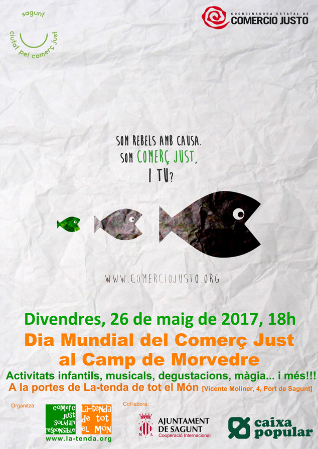 El Ayuntamiento de Sagunto y La Tenda de Tot el Món celebran el Día Mundial del Comercio Justo. Bajo el lema “Somos rebeldes con causa, Somos comercio justo. ¿Y tú?”, La Tenda de Tot el Món invita a la ciudadanía del Camp de Morvedre a celebrar este día el próximo viernes 26 de mayo, a partir de las 18.00 horas a las puertas de la Tenda, en el pasaje Vicente Moliner 4, de Puerto de Sagunto.