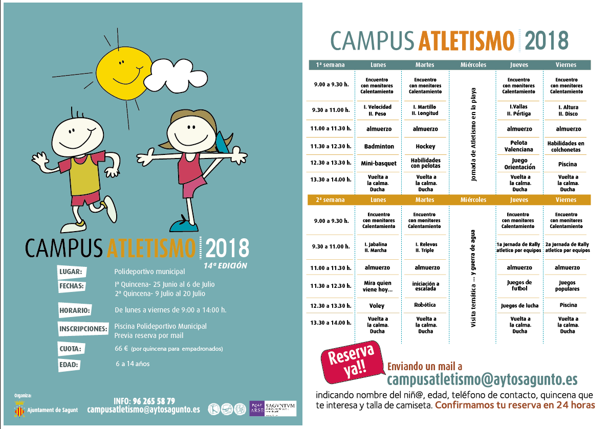 El próximo lunes, 25 de junio, se inicia el Campus Atletismo 2018. Este campus, destinado a niños y niñas de entre 6 y 14 años, está centrado en realizar actividades relacionadas con el atletismo, además de talleres con un carácter más lúdico relacionado con el verano. El campus de Atletismo tiene una duración de dos quincenas: desde el 25 al 6 de julio, y desde el 9 hasta el 20 de julio, y se lleva a cabo en el Polideportivo Municipal de Internúcleos.