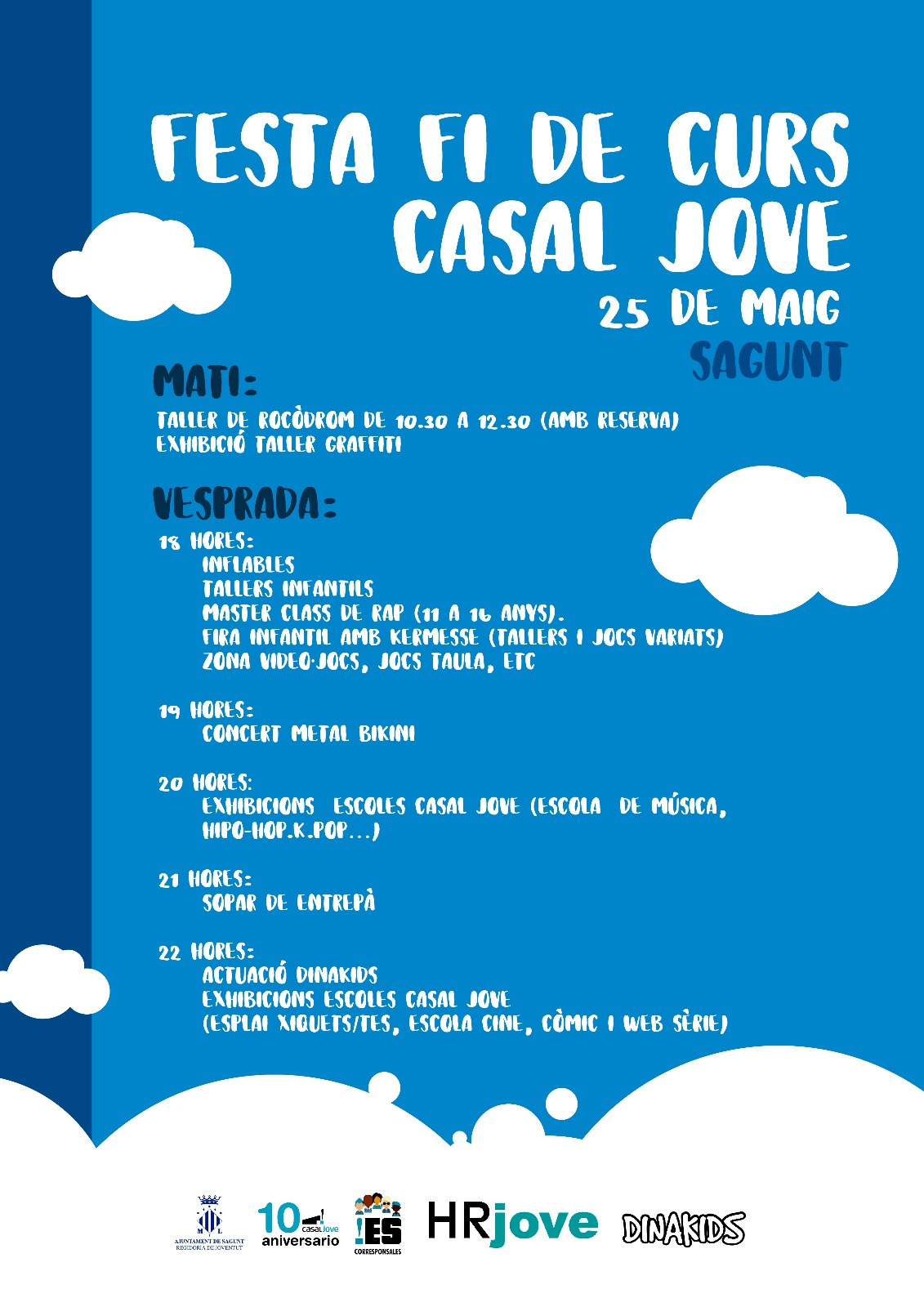 Por la mañana, de 10.30 a 12.30 horas se realizará un taller de rocódromo, previa reserva, así como una exhibición del taller de graffiti por parte del alumnado. Por la tarde, a las 18.00 horas, habrá hinchables, talleres infantiles, una masterclass de rap para jóvenes de 11 a 16 años y una feria infantil con Kermesse donde habrá talleres y juegos variados.