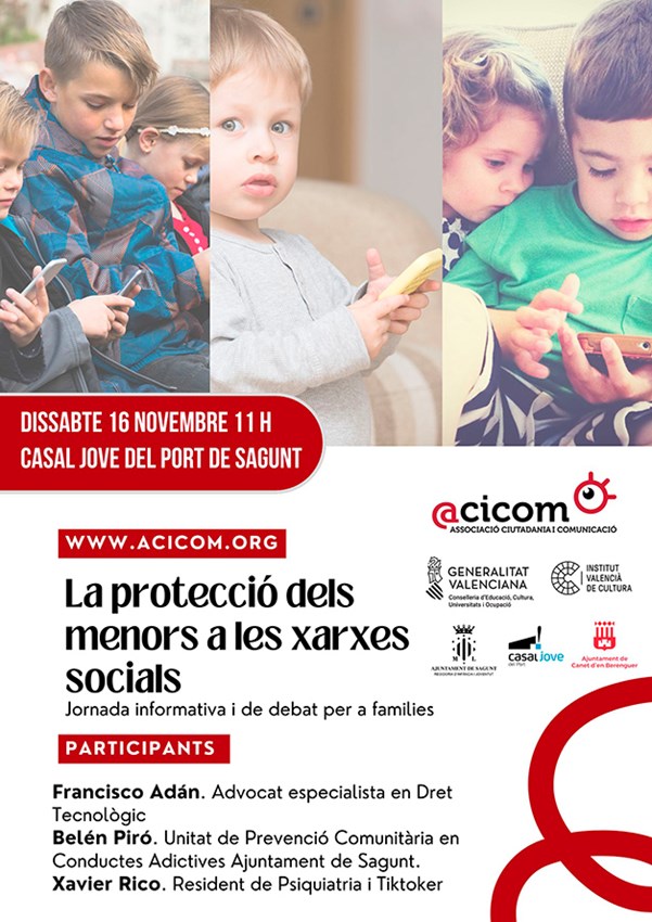 La protección de los menores en las redes sociales: Un desafío para las familias es el título de una jornada informativa que se desarrollará en el Casal Jove de Puerto de Sagunto el próximo sábado 16 de noviembre a las 11 horas. Esta iniciativa ha sido organizada por la Associació Ciutadana i Comunicació (Acicom) en colaboración con la concejalía de Juventud e Infancia del Ayuntamiento de Sagunto.