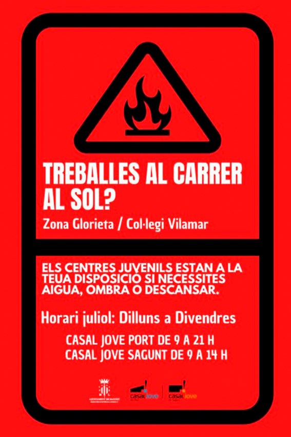 Esta ola de calor, calificada como una de las más intensas, duraderas y extensas, ha afectado a toda la península las últimas semanas y se prevé que este clima continúe unos días más. Por eso, desde la Concejalía de Juventud e Infancia se ponen a disposición de todas las personas que trabajan en la calle sus centros juveniles. Tanto el Casal Jove Puerto (c/ Vent de Marinada s/n) cerca del colegio Vilamar, como al Casal Jove Sagunto (c/ Romeu, 8) cerca de la Glorieta, están abiertos de 9 a 21 horas y de 9 a 14 horas, respectivamente, de lunes a viernes para todos y todas aquellas trabajadoras que necesiten agua, sombra o descansar.