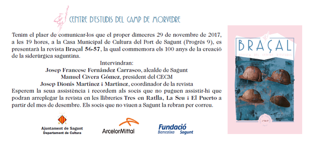 ​El Centre d’Estudis del Camp de Morvedre presenta un nuevo número de la revista Braçal. Mañana, miércoles 29 de noviembre, a las 19.00 horas, la Casa Municipal de Cultura de Puerto de Sagunto acogerá el acto de presentación del número 56-57 de la publicación. La presentación está enmarcada en los actos del centenario de la siderurgia.