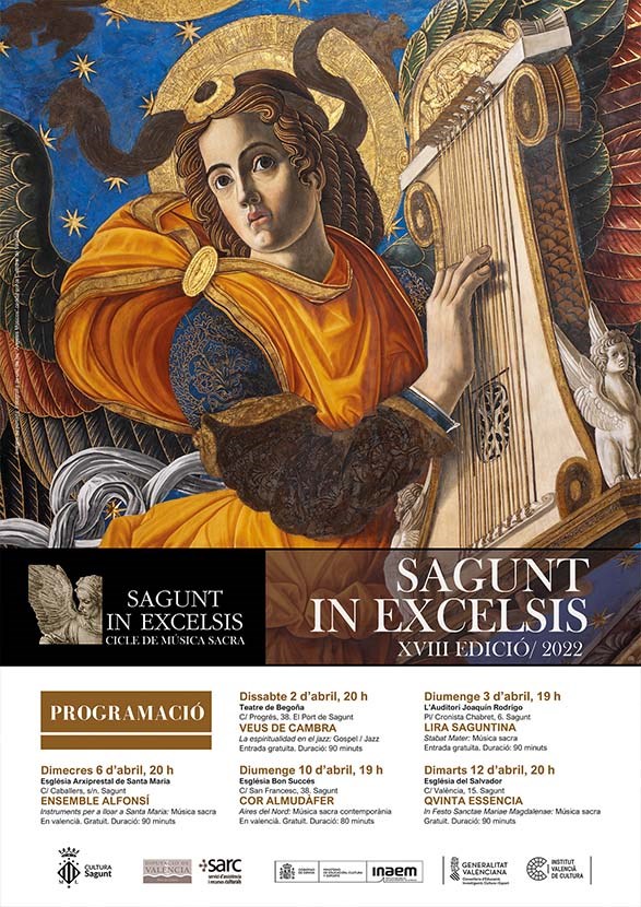La XVIII edición de Sagunt in Excelsis finaliza mañana martes, 12 de abril, con el concierto de música sacra In Festo Sanctae Mariae Magdalanae de Qvinta Essençia. La actuación, que es apta para todos los públicos, tendrá lugar a las 20 horas en la Iglesia del Salvador. La entrada es gratuita y tendrá una duración de 90 minutos.