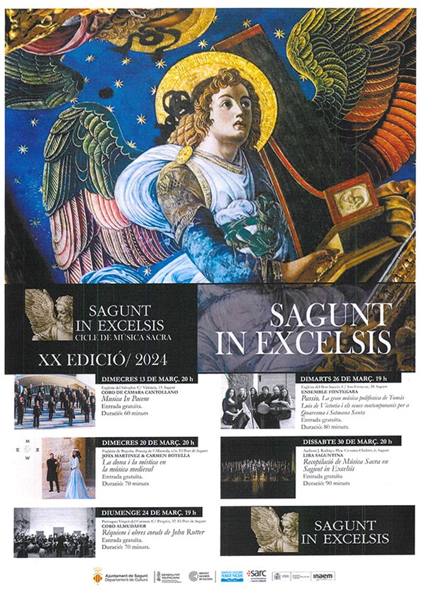 La XX edición del ciclo de música sacra Sagunt in Excelsis, que organiza el departamento de Cultura del Ayuntamiento de Sagunto, comienza este miércoles, 13 de marzo, y contará con cinco actuaciones gratuitas, que se desarrollarán hasta el 30 de este mismo mes.