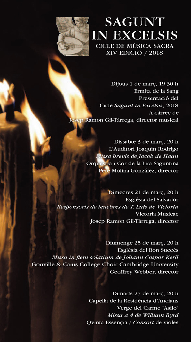 El ciclo de conciertos comenzará el sábado 3 de marzo, a las 20 horas, con la interpretación de la Missa brevis de Jacob de Haan por parte de la orquesta y el coro de la Sociedad Musical de la Lira Saguntina dirigidos por su director titular y artístico, también de la Orquesta de Cámara de Valencia y director musical residente del Teatro Serrano de Gandía durante las temporadas 2012-2017, Pere Molina-González, uno de los platos fuertes que recomienda el concejal de Cultural. La soprano solista será la saguntina Marina Díaz, cuya trayectoria cuenta con varias actuaciones como soprano solista en El Fantasma de la Ópera o en el Réquiem de Fauré. Como trompeta soprano y orquesta y solista, será el actual director de la Onda Big Band y de la Vall d’Uixó Big Band, Manolo Díaz.