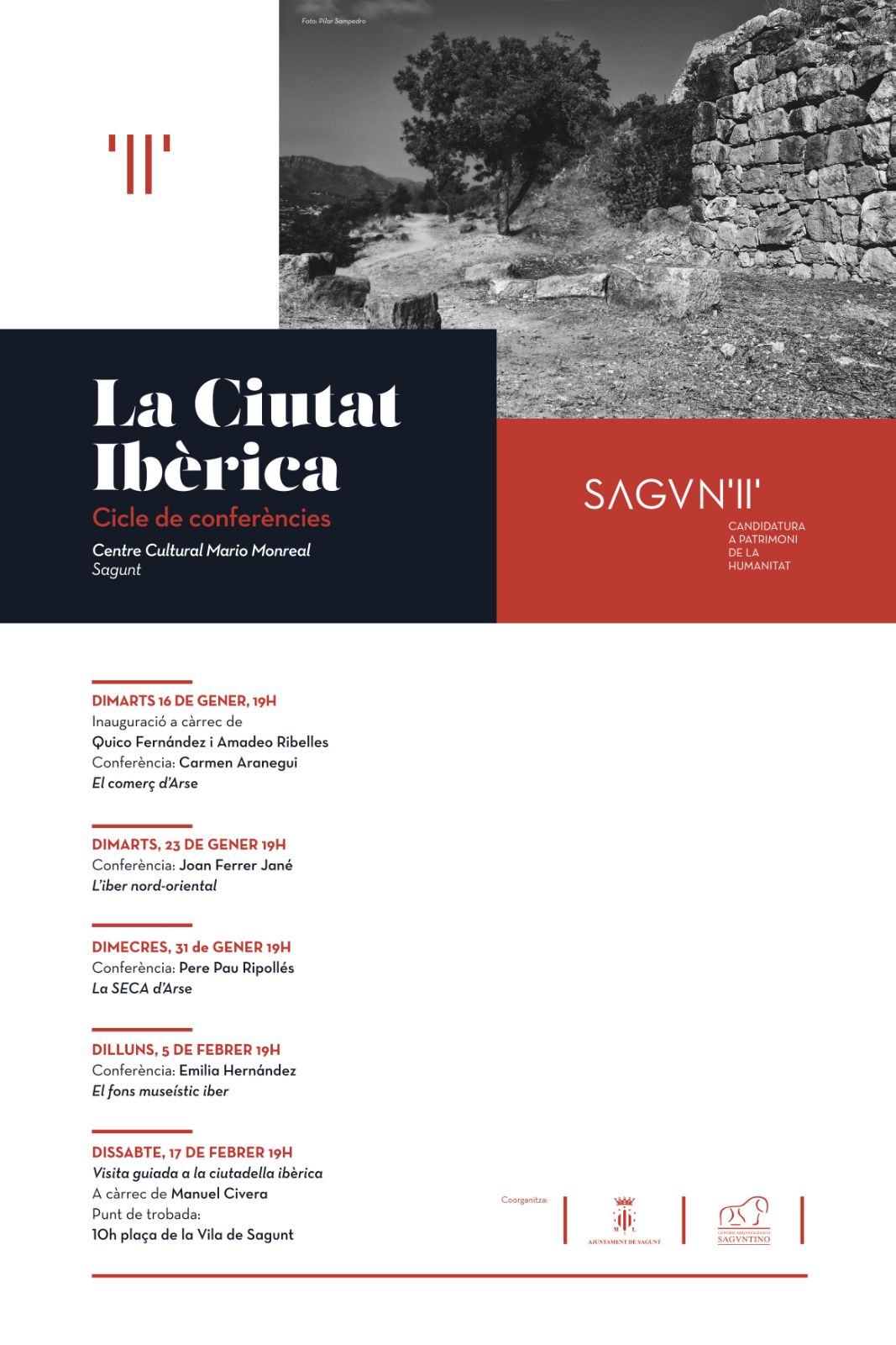 El ciclo La ciutat ibèrica ha contado con un total de cuatro conferencias a cargo de destacados estudiosos de esta época, como la catedrática Carmen Aranegui; el escritor y profesor experto en lenguas prehispánicas, Joan Ferrer; uno de los numismáticos más importantes de la península, Pere Pau Ripollés, o la arqueóloga y directora del Museo Histórico de Sagunto (MUHSAG), Emilia Hernández. Este evento forma parte del proyecto de Patrimonio de la Humanidad en el que el Ayuntamiento de Sagunto está trabajando para conseguir la distinción que otorga la UNESCO.