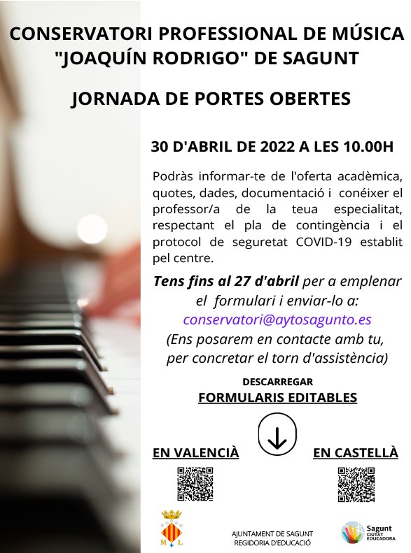 El conservatorio profesional de música Joaquín Rodrigo de Sagunto realiza la jornada de puertas abiertas el sábado, 30 de abril, a las 10.00 horas para que las personas interesadas puedan informarse de la oferta académica, las cuotas, la documentación y el profesorado de cada especialidad.