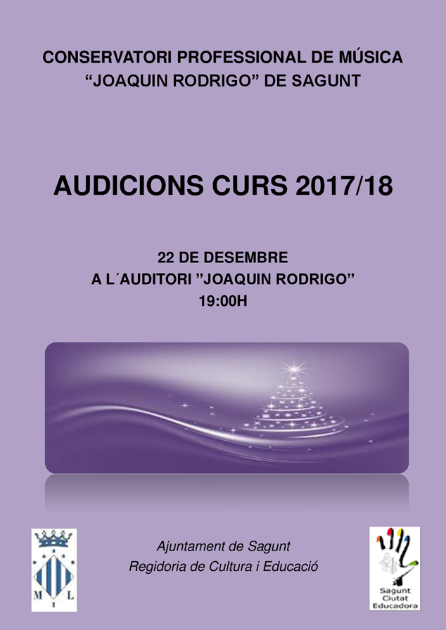 La delegación de Educación del Ayuntamiento de Sagunto organiza las audiciones del curso 2017/2018 del Conservatorio Profesional de Música ‘Joaquín Rodrigo’ de Sagunto. A partir de hoy hasta el jueves 21 de diciembre, el Centro Cultural Mario Monreal acogerá las audiciones de los alumnos y alumnas, a las 19.00 horas.