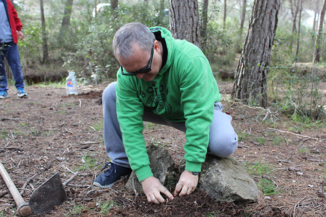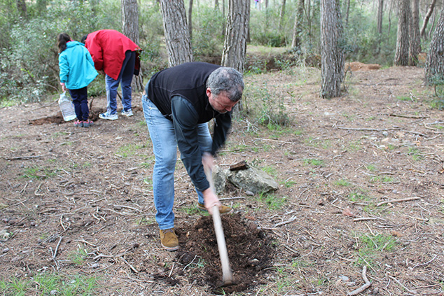 Una vez acabado el almuerzo, se procedió a la repoblación de esa zona del bosque con centenares de ejemplares de cuatro tipos de árboles: lentiscos, pinos blancos, carrascas y madroños. Durante la planta, se colocó una pancarta de la plataforma ciudadana creada para la protección de esta montaña como paraje natural municipal y se compartió con el público experiencias e ilusiones.