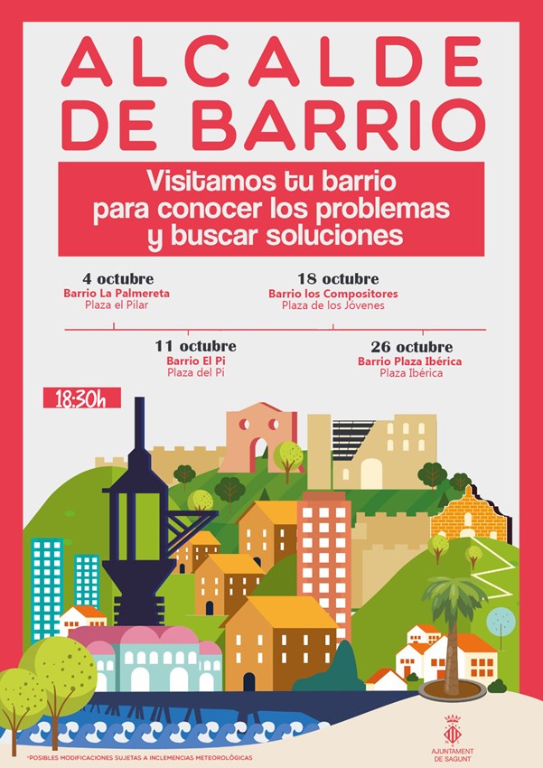 La iniciativa Alcalde de Barrio, impulsada por el departamento de Participación Ciudadana y la Alcaldía del Ayuntamiento de Sagunto, mantendrá durante este mes de octubre cuatro nuevas citas en los barrios la Palmereta, el Pi, los Compositores y plaza Ibérica.