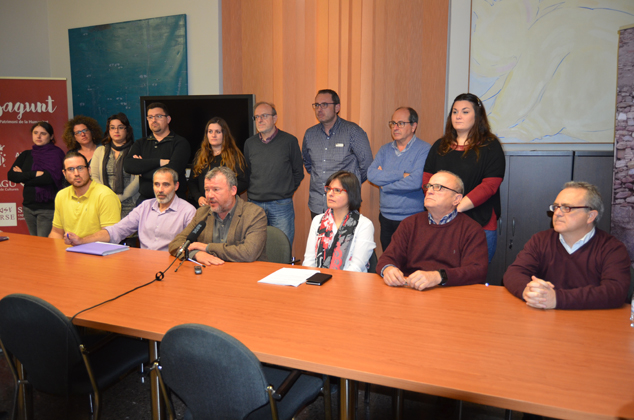 El alcalde de Sagunto, Quico Fernández, junto al Equipo de Gobierno, formado por los grupos políticos Compromís, Esquerra Unida, ADN Morvedre y PSPV-PSOE han ofrecido una rueda de prensa tras la recusación presentada por la empresa Lafarge Holcim en la que se recusa a dos funcionarios del ayuntamiento, concretamente al secretario general y al jefe de Urbanismo, en relación a los expedientes que afectan a la compañía cementera.