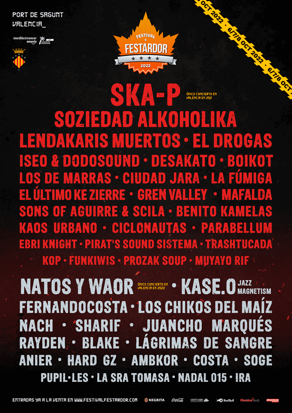 La octava edición del conocido y popular Festardor regresa a Puerto de Sagunto un año más. La cita tendrá lugar del 6 al 8 de octubre y se consolida como uno de los festivales más potentes y disruptivos del panorama del rock y el rap/hip-hop nacional, acogiendo las únicas actuaciones en la Comunidad Valenciana de los grupos Ska-P y de Natos y Waor en 2022.