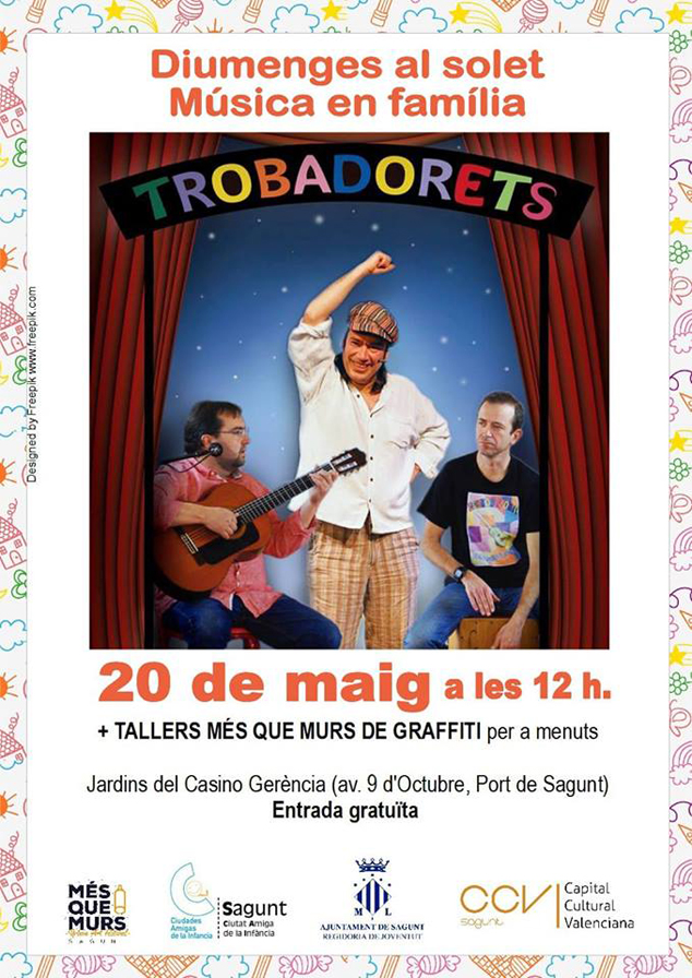 Para el domingo, a las 12 h en los Jardines del Casino Gerencia, se ha organizado un concierto familiar con la banda Trobadorets, grupo de rock infantil dirigido, principalmente, a niños y niñas de 3 a 11 años. Además de la actuación musical, durante la mañana también se realizarán talleres infantiles de graffiti.