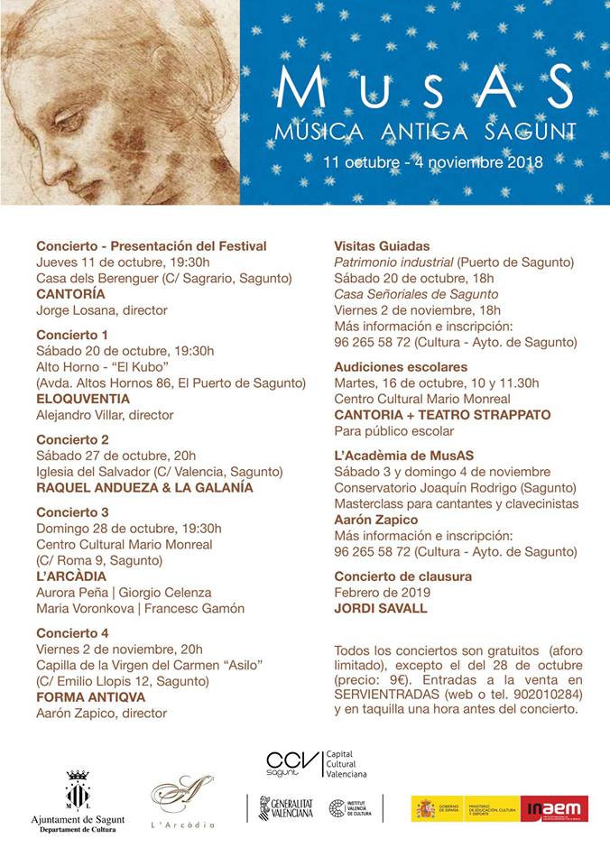 El cuarto concierto tendrá lugar el viernes 2 de noviembre a las 20 horas en la Capilla de la Virgen del Carmen (C/Emilio Llopis, 12), en Sagunto. En esa ocasión actuará el grupo Forma Antiqva dirigido por Aarón Zapico. El concierto de clausura tendrá lugar en febrero de 2019 a cargo de Jordi Savall.