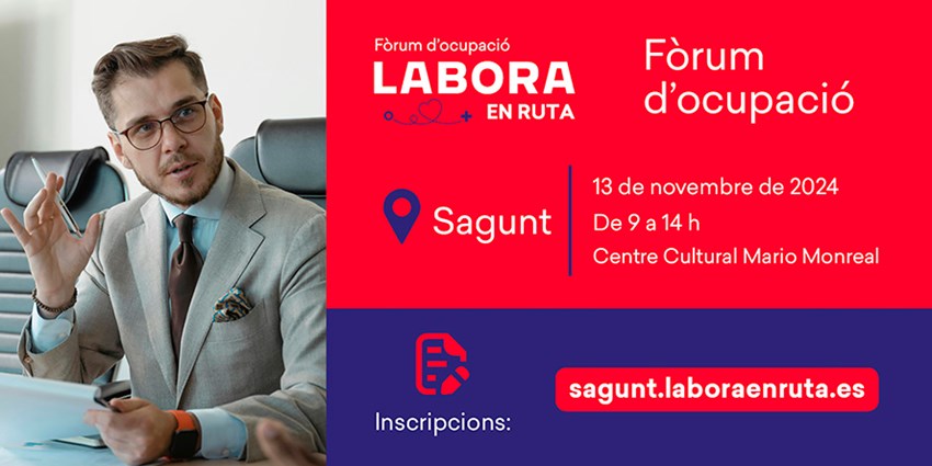 El próximo miércoles 13 de noviembre Sagunto acogerá el Foro de Empleo organizado por Labora en Ruta, un evento clave para la promoción de la inserción laboral y el desarrollo profesional en la Comunidad Valenciana.