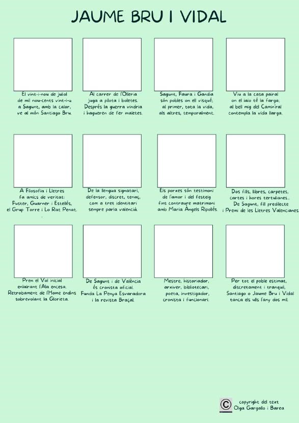Con motivo del centenario del nacimiento del poeta e historiador Jaume Bru i Vidal (1921-2000), el Gabinete de Promoción del Valenciano del Ayuntamiento de Sagunto ha convocado un concurso donde se premiará a la auca que mejor ilustre su vida y obra, hecha a partir de los doce redondeles elaborados por la profesora de lengua y literatura Olga Gargallo.